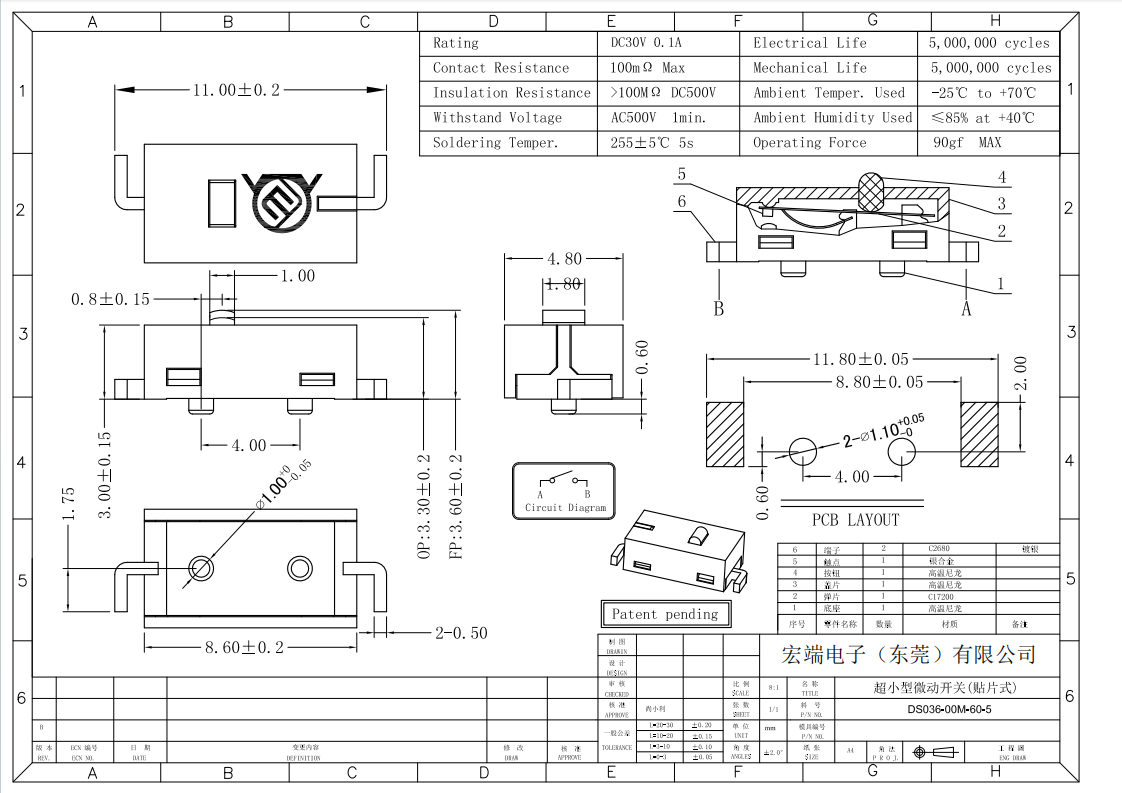 操 作 力:260±50gf