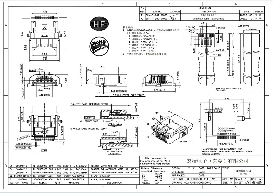 品名:0.8mm间距 9P 血糖仪试纸座 SK-0009S00-111-1A2H