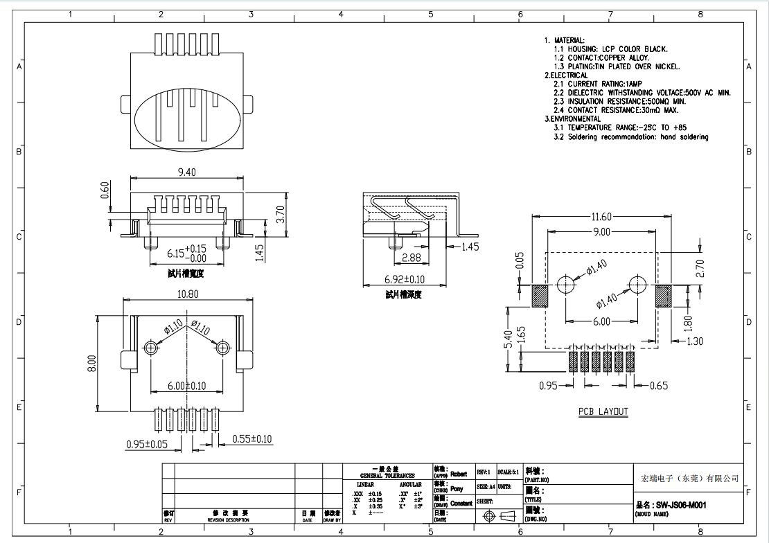 品名: SW-JS06-M001 0.95mm间距 6P 常规 无退条功能