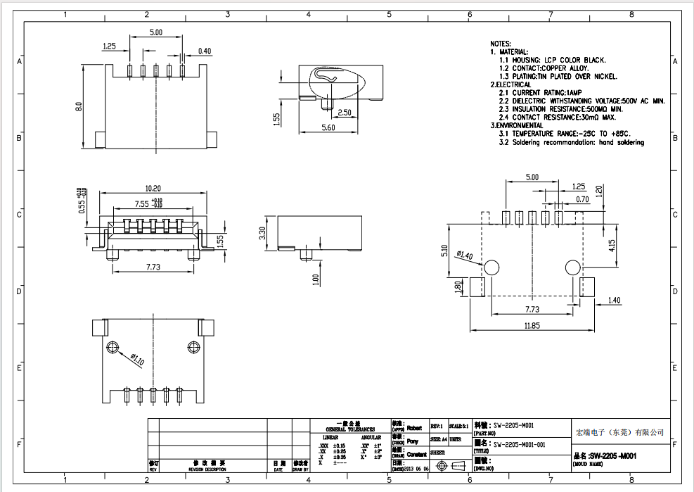 品名: 1.25mm间距 5P 常规 无退条功能 SW-2205-M001